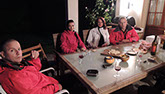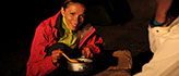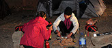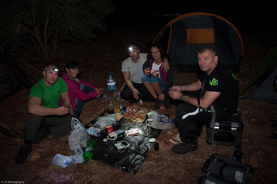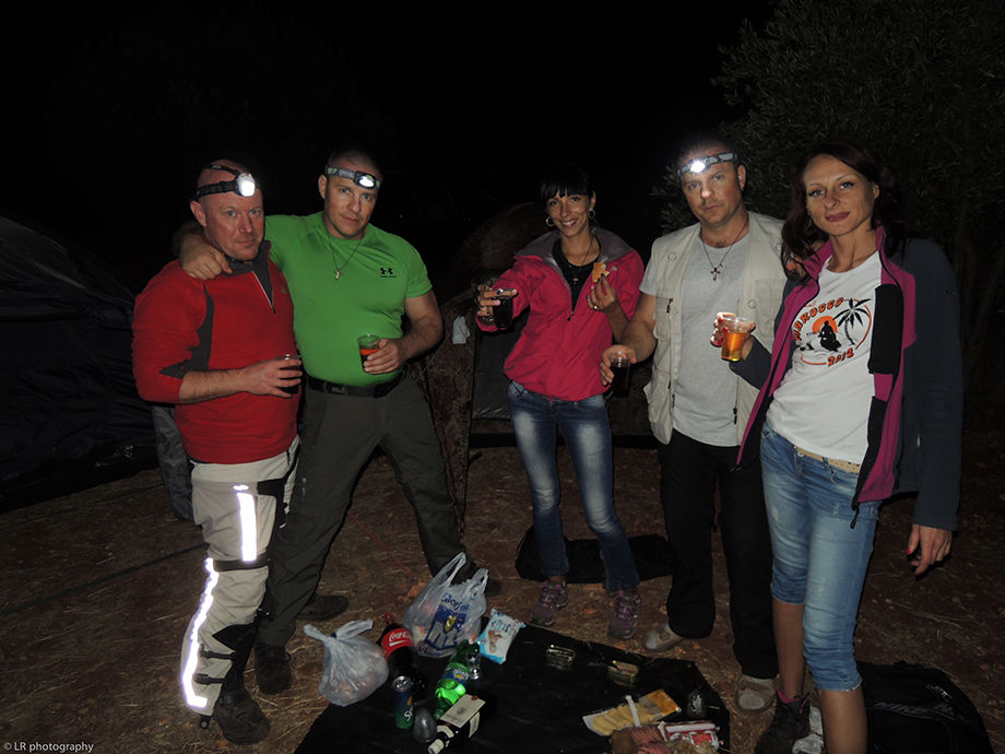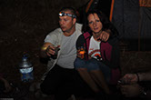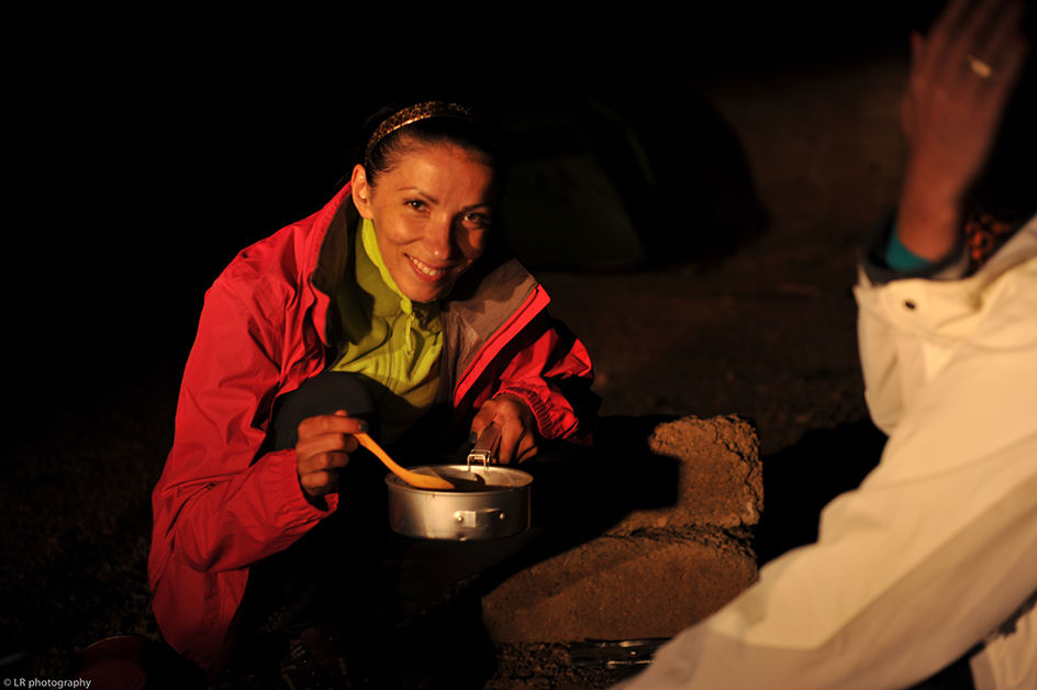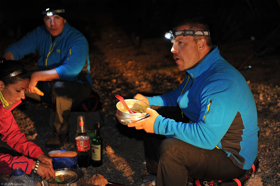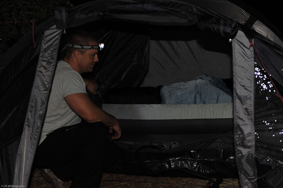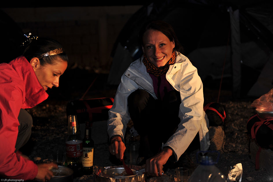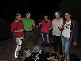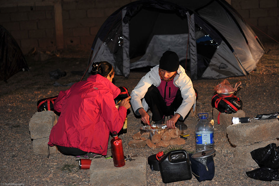 Près d'une heure a été nécessaire pour monter le camp, c'est un reccord dans la durée...! Il faut dire que Zenia a prévu un matelas gonflable qui est plus gros que sa tente, alors ça ne facilite pas les choses. Heureusement que Julia s'est dévouée pour le gonfler, et après une bonne heure a pomper...le matelas...ça y est le bivouac est fin près et on peu se mettre à table !