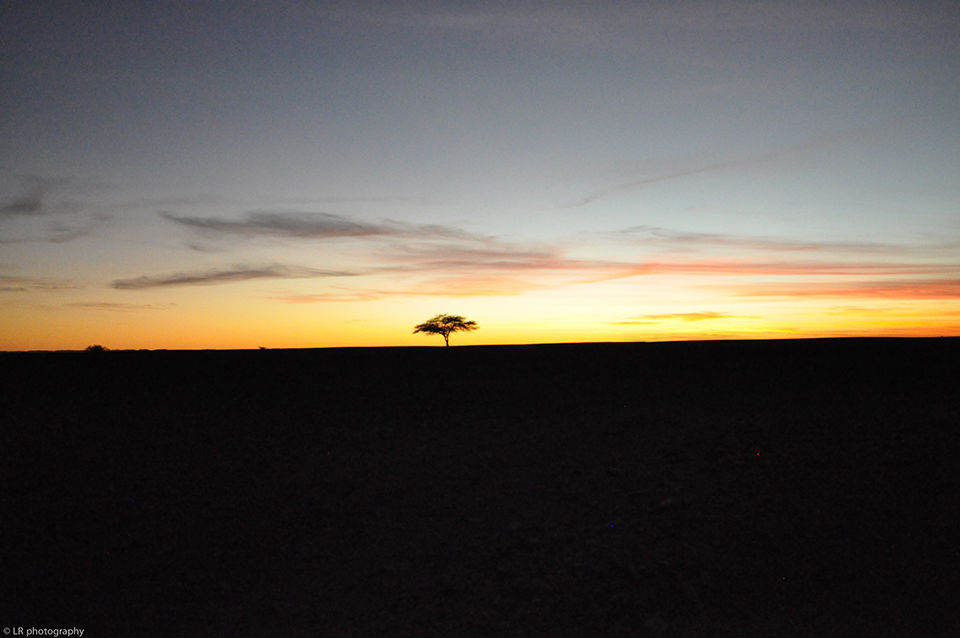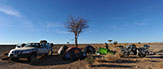 Nous avons roulé toute la journée quasiment sans stop et pourtant, à 23:00 nous ne sommes qu'à la moitié du parcours. On décide de trouver un endroit pour dormir et on finira par planter le bivouac entre les cailloux, au pied d'un des rares arbres aux environs.