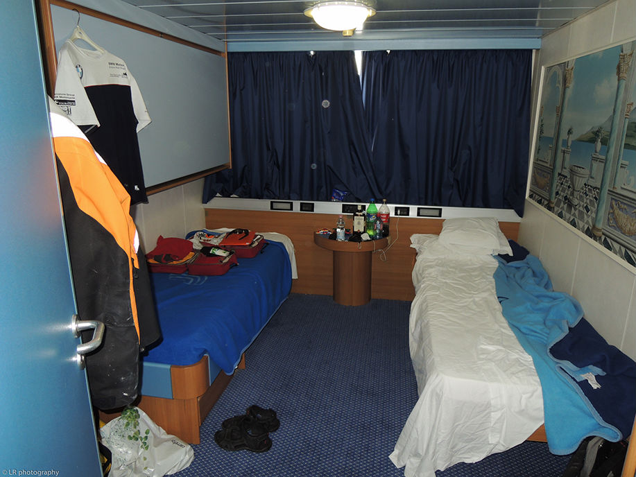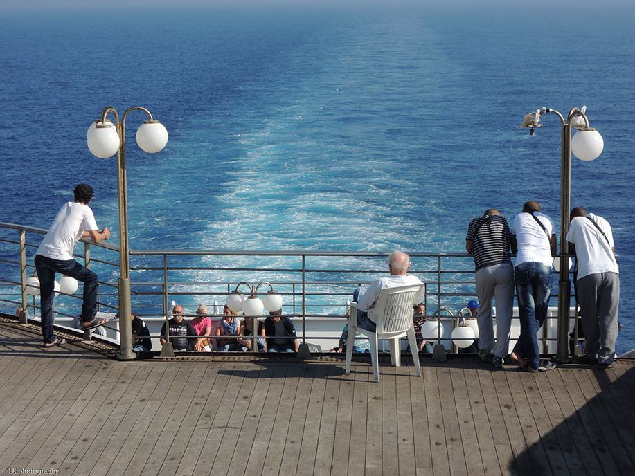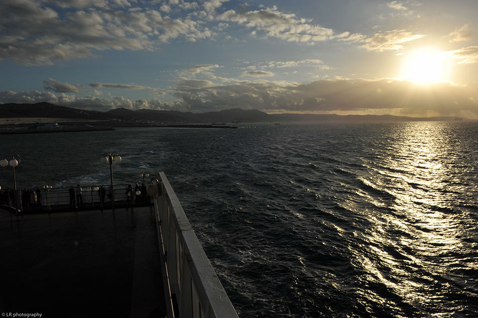 Parti le matin de Lausanne et après une course contre la montre pour ne pas louper notre ferry, nous embarquons au port de Sète autour de 16:00, on devra patienter jusqu'à 21:00 pour voir le monstre d'acier se décoller des quais. C'est vraiment impressionnant de voir ces tonnes d'acier se laisser manoeuvrer au centimètre près...bref...on est enfin dans les eaux bleues de la Méditerranée, et on en a pour 36 heures.