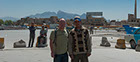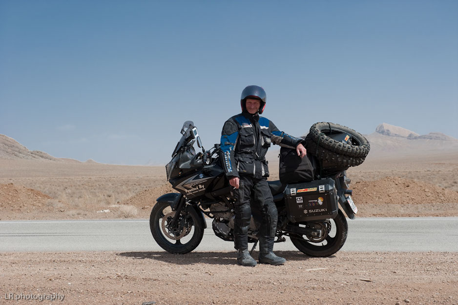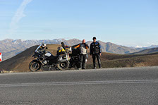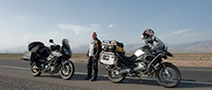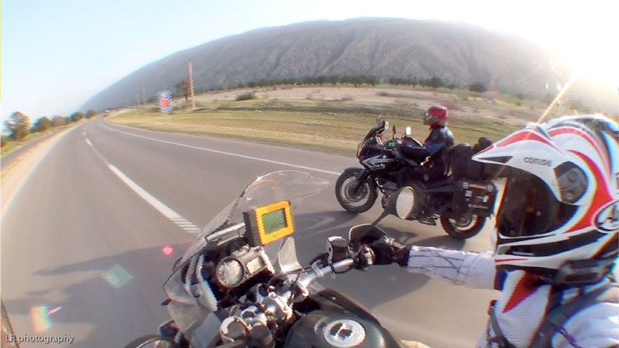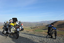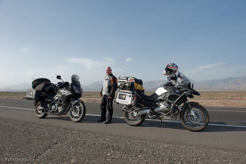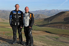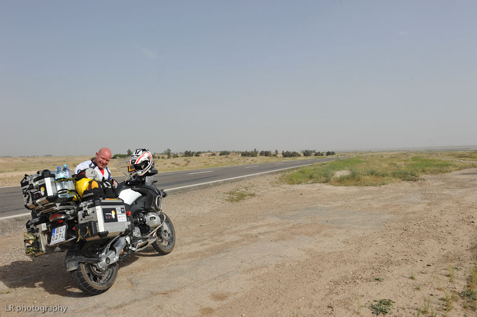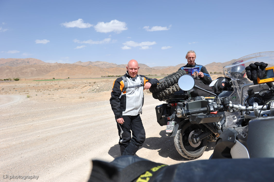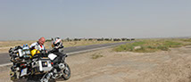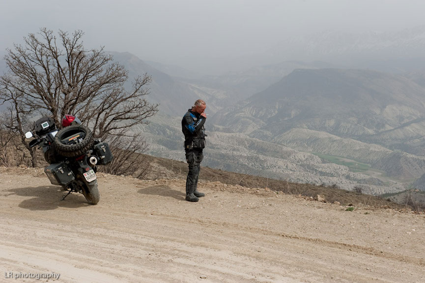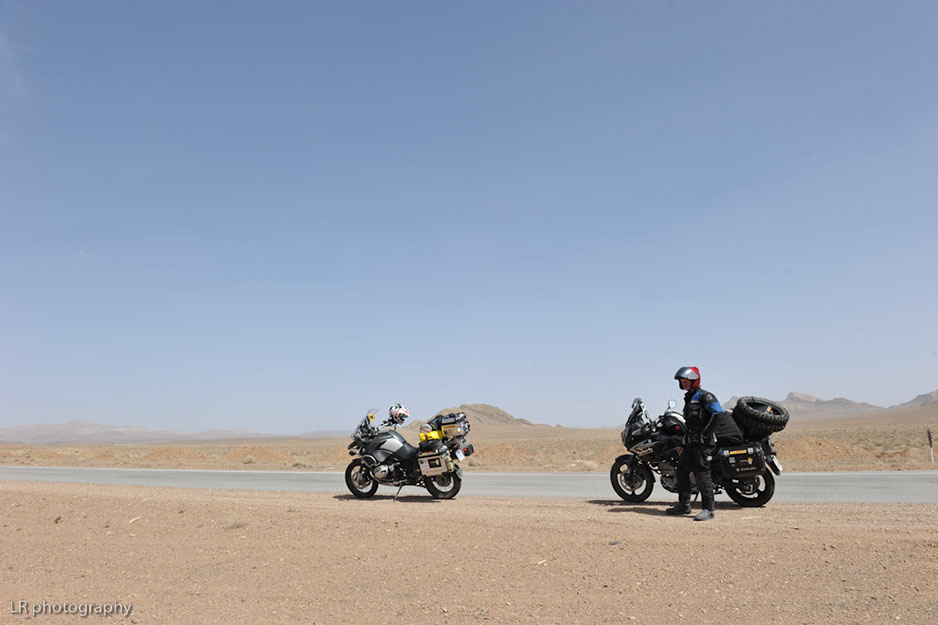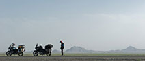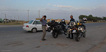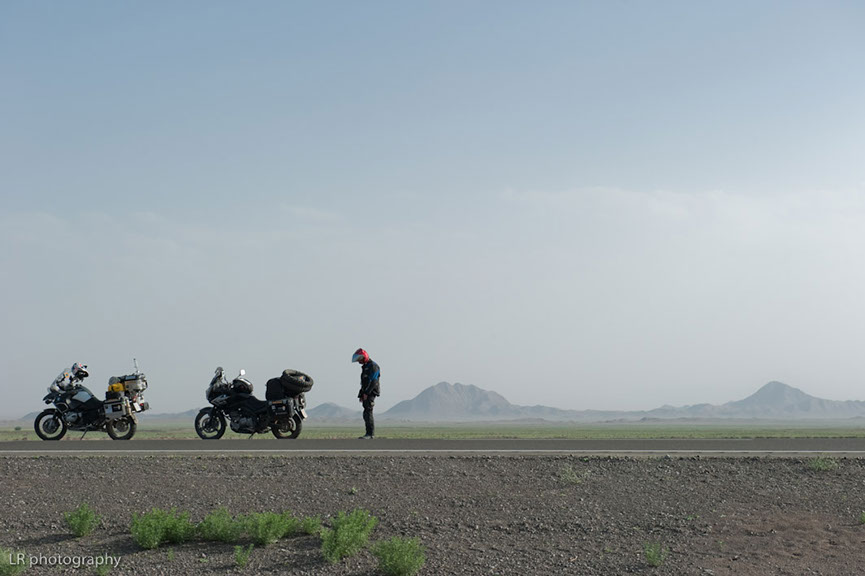 Par bonheur, peu avant l'arrivée au poste frontière nous sommes tombés sur Shane et Alex, un couple de motard de Dubai, revenant du Turkmenistan et rentrant chez eux. Ils nous ont très gentillement offert un bon bol de thé, bien chaud, avant de continuer notre route dans le froid et le brouillard.