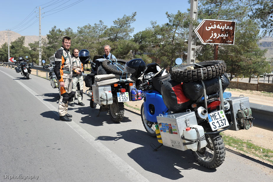 Nous avons fait étape durant deux jours dans la belle ville de Shiraz, tout d'abord pour y visiter le site de Persépolis, distant de 50km, et également pour prendre un jour de repos physique et mécanique aussi. Les bagages alu de nos bécanes ayant quelque peu souffert d'un petit choc survenu quelques jours plus tôt. Accident où nous sommes seuls responsables car nous nous sommes percutés ensemble dans un giratoire :-)))