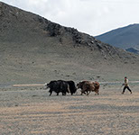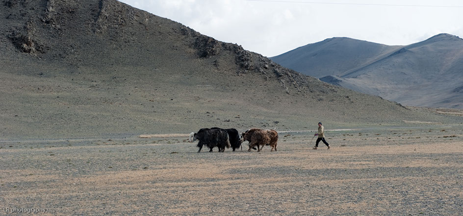 jeune berger et son petit troupeau de yaks au milieu de nul part. Ici les bêtes parcourent des kilomêtres chaque jour pour trouver quelques souches d'herbe sèches comme de la paille.