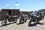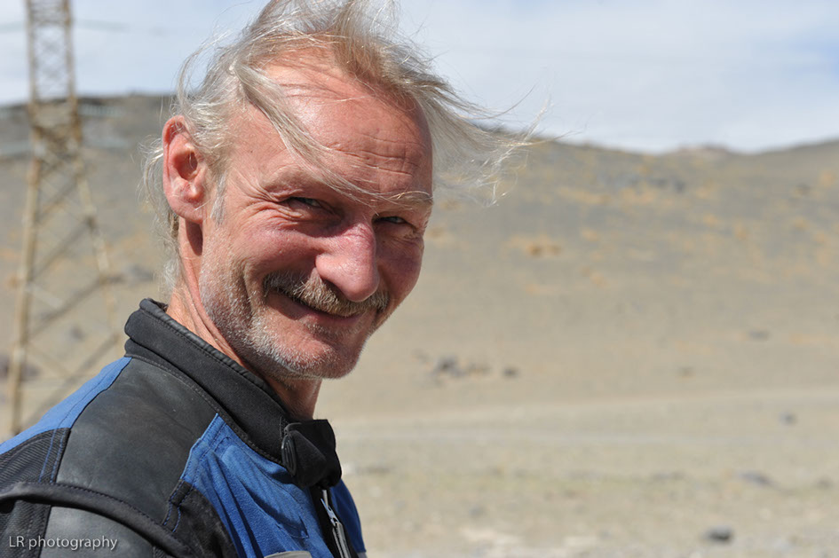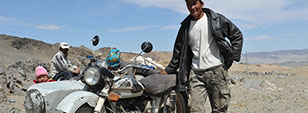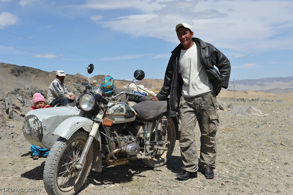 Au sommet d'un col, si l'on peut appeler ça ainsi, nous croisons une famille se déplaçant en side-car. D'où viennent-ils, où vont-ils..? Ici on est au beau milieu de rien! A perte de vue il n'y a que...rien! Des cailloux et des massifs rocheux..et une ligne électrique, seule preuve que cette piste nous mène vraisemblablement quelque part :-)