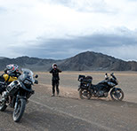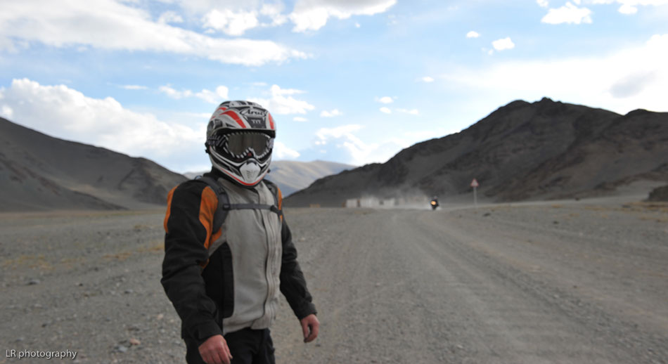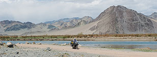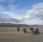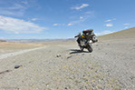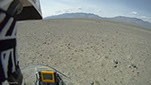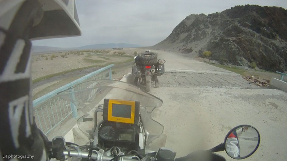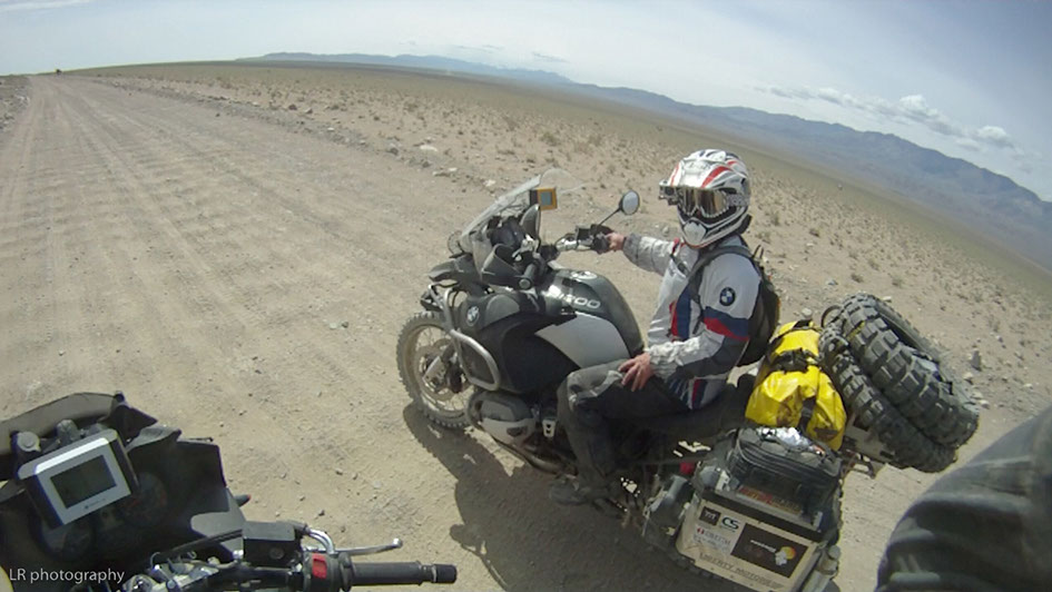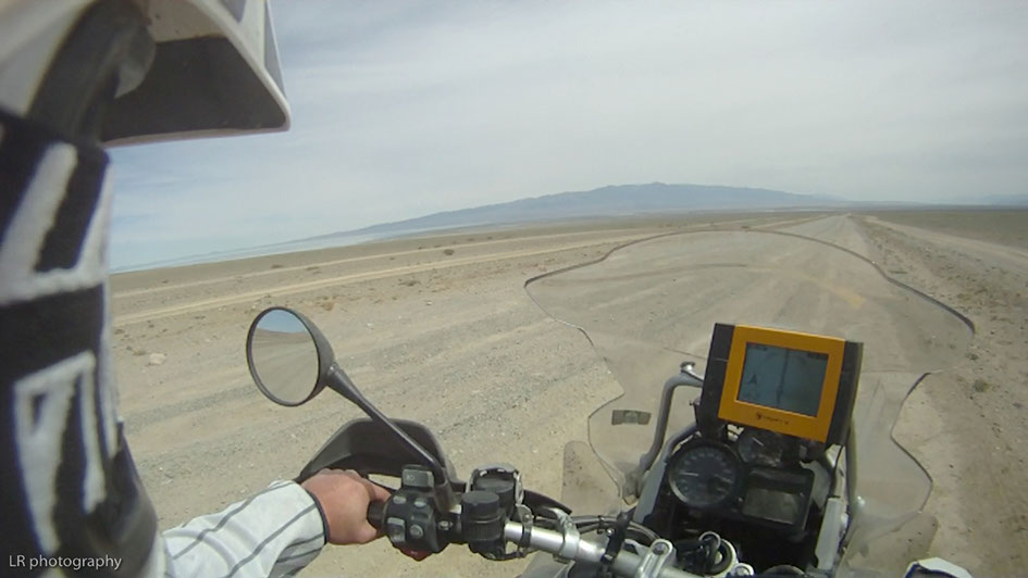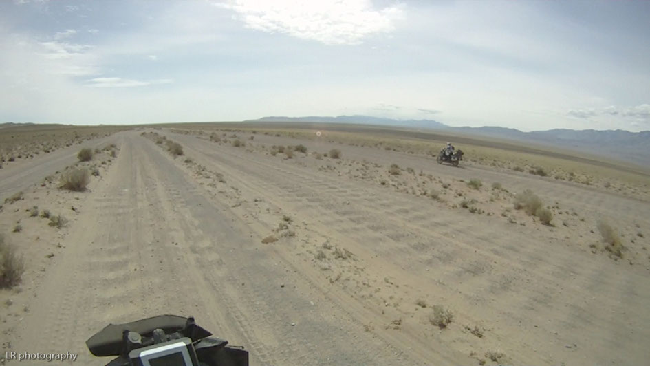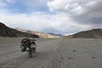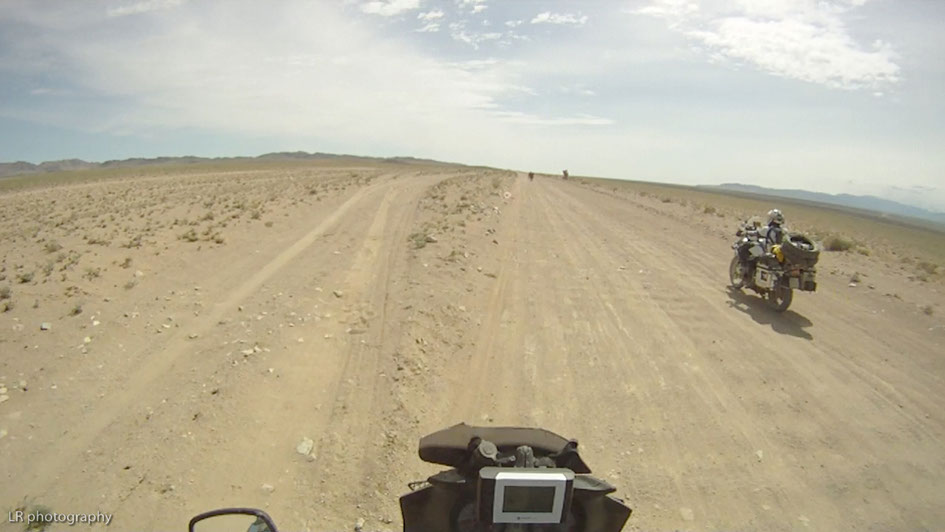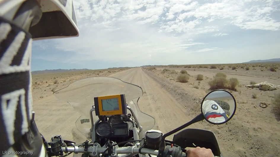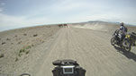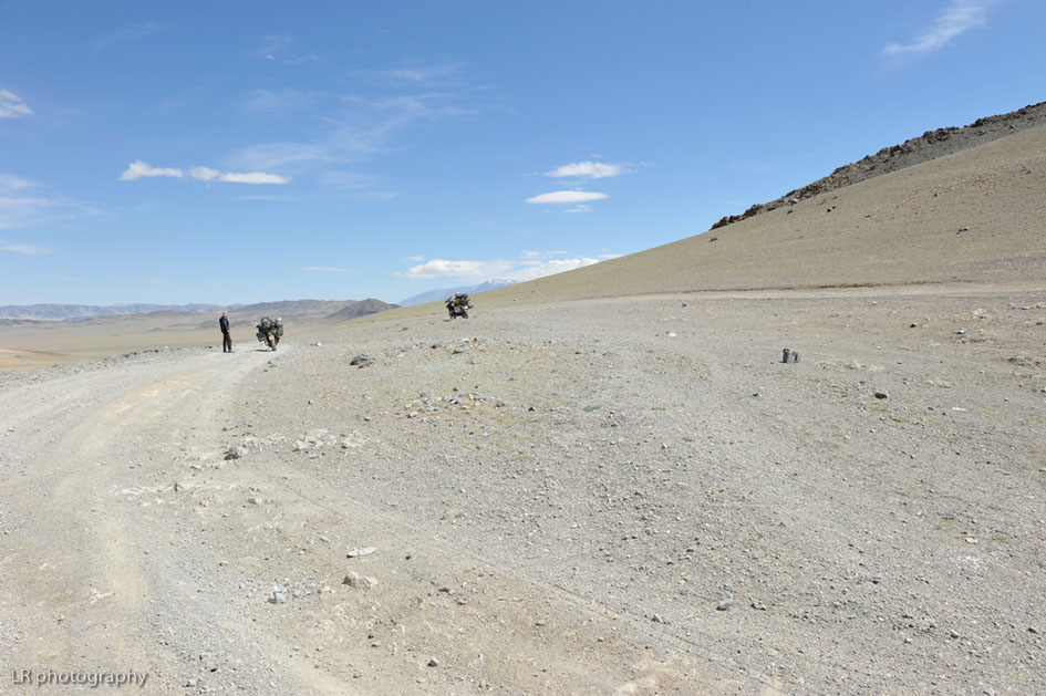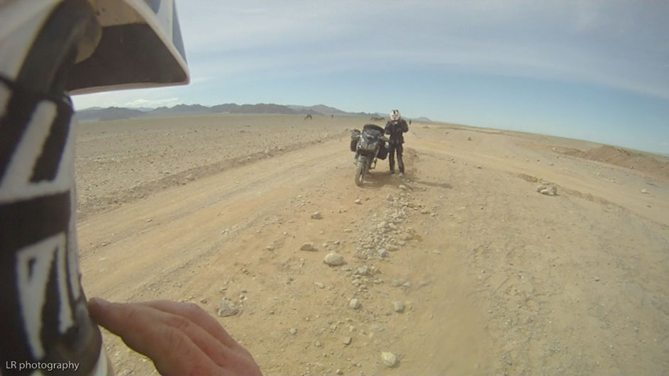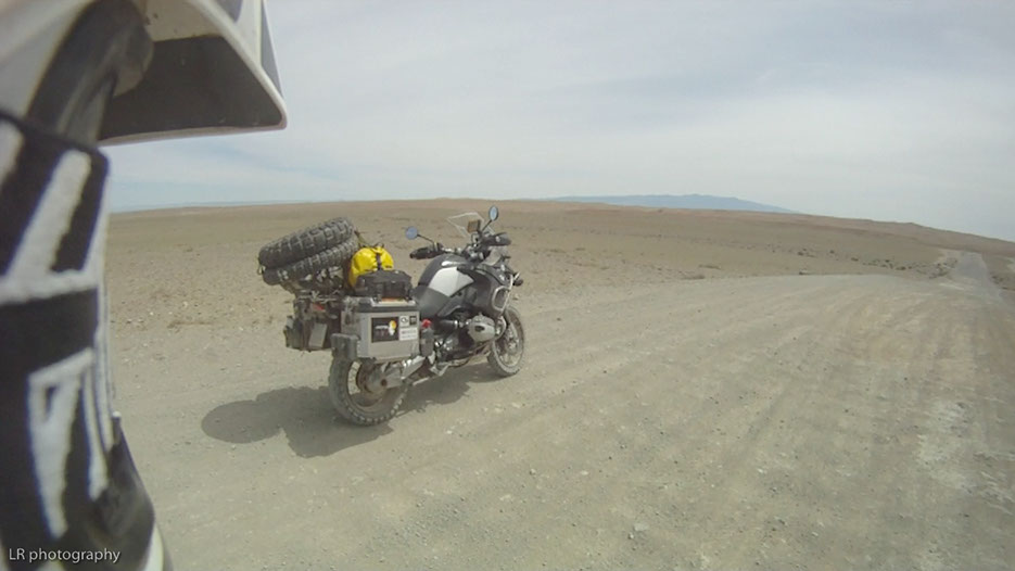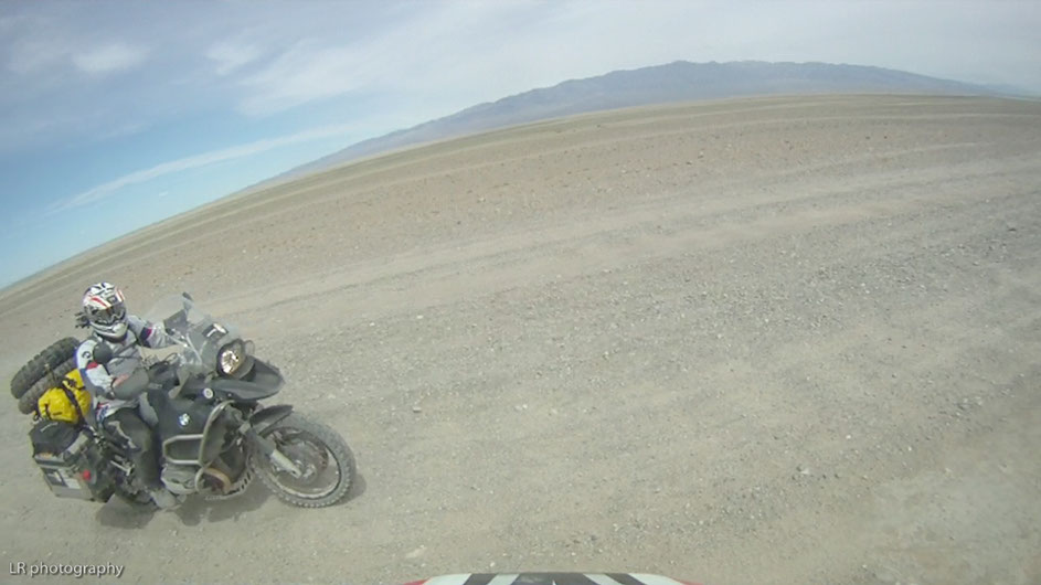 La plaine serpente entre quelques massifs rocheux et s'élargit encore. Nous avons l'impression de rouler dans le lit asséché d'une gigantesque rivière, mais ici les cailloux sont très anguleux, coupants. Plus aucun repère d'une quelconque piste n'est visible, seule la trace de notre RB nous indique le cap à suivre. Cela devient presque impossible d'avancer, les cailloux sont de plus en plus gros, et les motos de plus en plus difficiles à tenir.