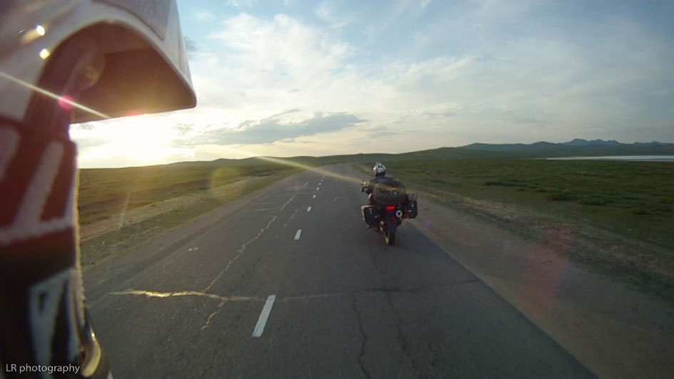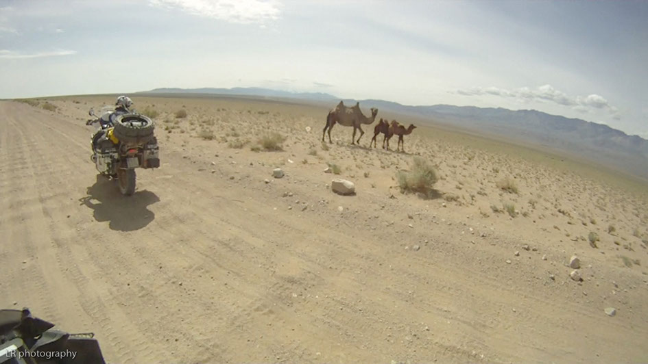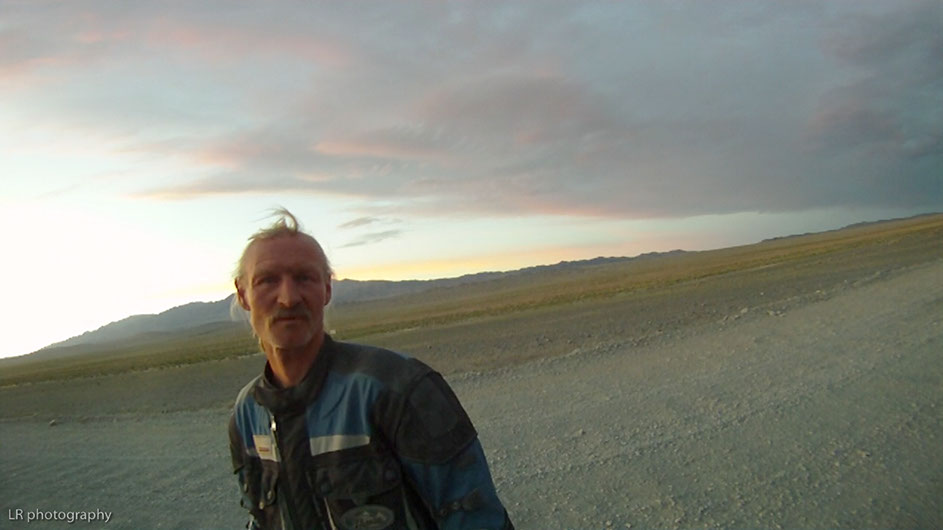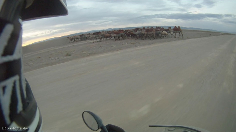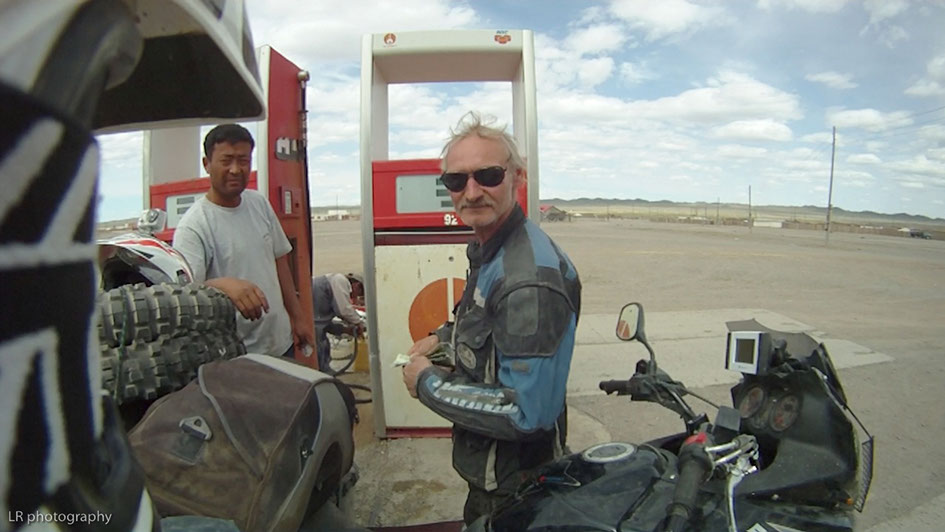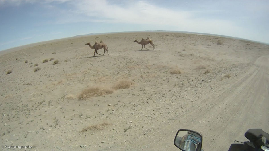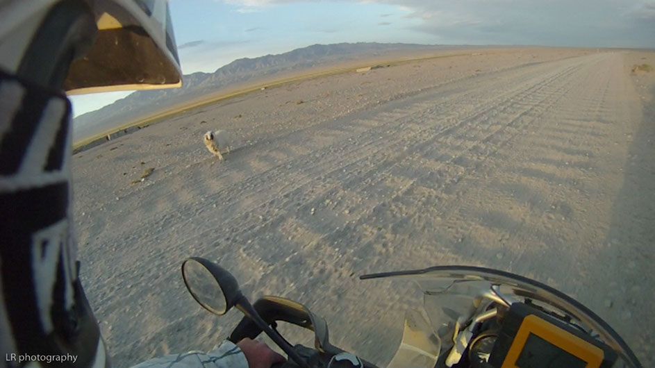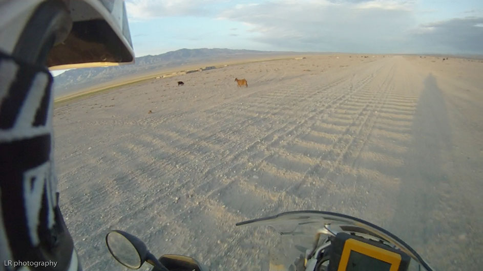Nous avons encore 290km au RB jusqu'à Altai. Pari fou ou pari gagnant pour ne perdre qu'un minimum de jours? ... Les deux à la fois! Le pari fou, c'est de rouler de nuit dans le désert, et on le verra très vite, le soir même. Le pari gagnant, on s'en rendra compte plus tard, à Vladivostok, où une trop grande perte de temps nous aurait complètement pénalisé pour la suite du voyage en Asie du Sud-Est (si nous étions arrivés à Vladivostok 2 jours plus tard, nous aurions perdu au moins une semaine pour l'envoi de nos bécanes par bateau...)