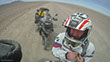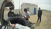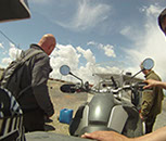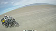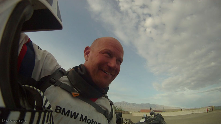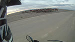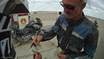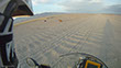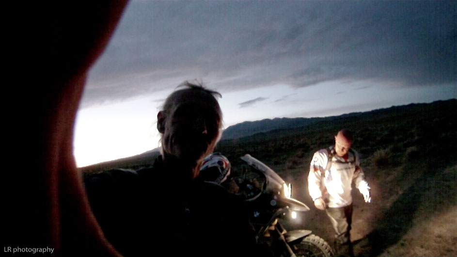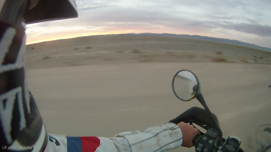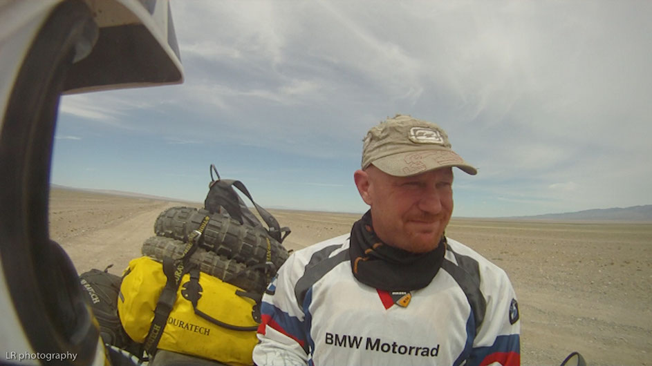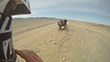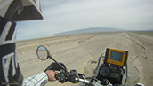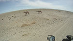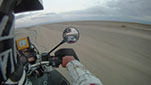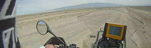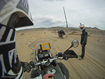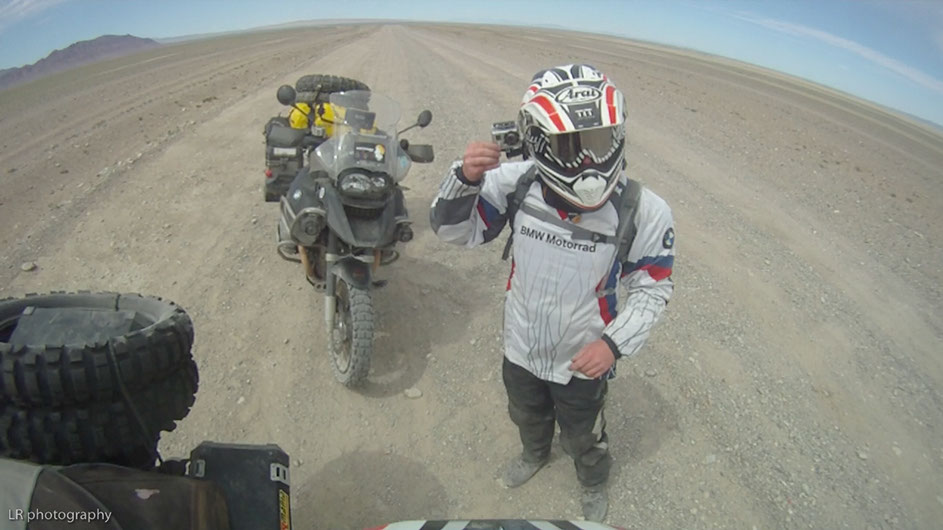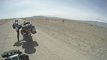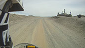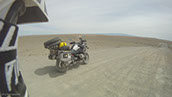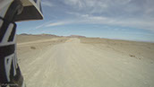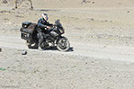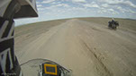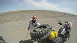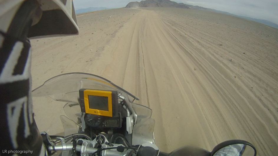 Durant les premiers kilomètres, il nous faut comprendre comment rouler sur ce nouveau terrain, comprendre et tâcher de bien interpréter les différences de couleur de la caillasse et du sable. Plus le sol devient jaune et plus il faut être sur nos gardes, cela annonce généralement une zone de sable. Crothe en fait très vite la douloureuse expérience. Certaines zones sableuses sont si instables qu'il nous est pratiquement impossible de rouler dedans, surtout avec le poids de nos machines.
