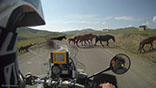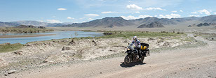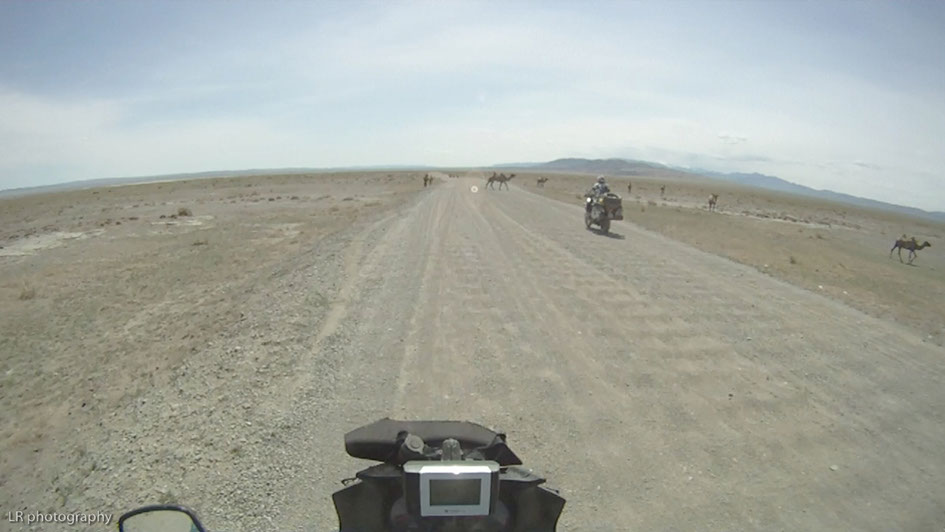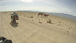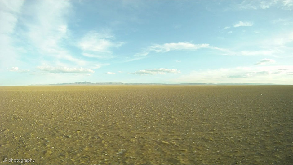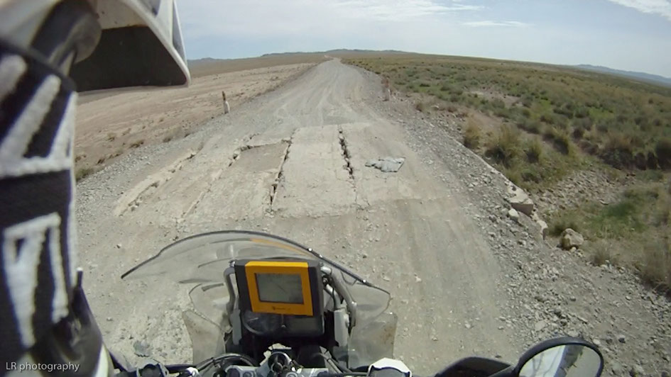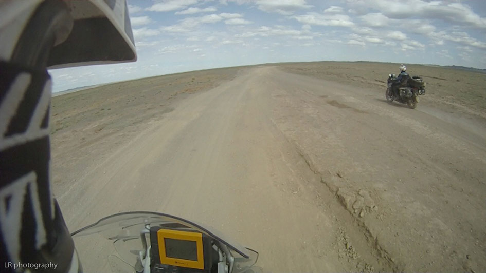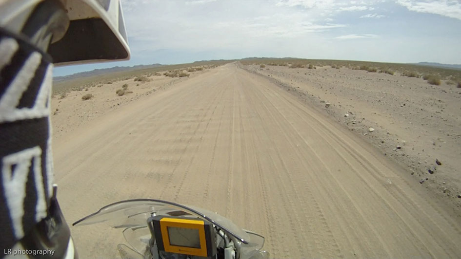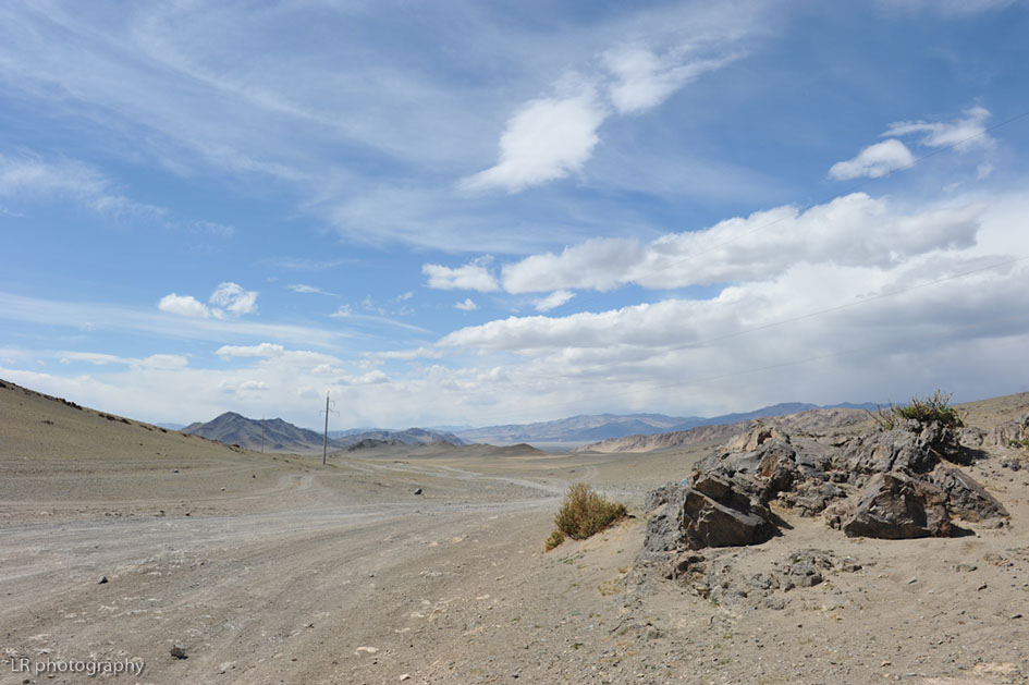 Un peu plus loin nous rejoignons effectivement l'axe principal reliant Olgii à Khovd. Cette "route" est en fait une piste de sable et de cailloux très tassés. La tôle ondulée, que nous retrouverons sur quasi l'ensemble des axes principaux, nous oblige à rouler à une allure plus soutenue, sinon c'est la foire aux vibrations...mais gare aux zones sableuses tout de même..