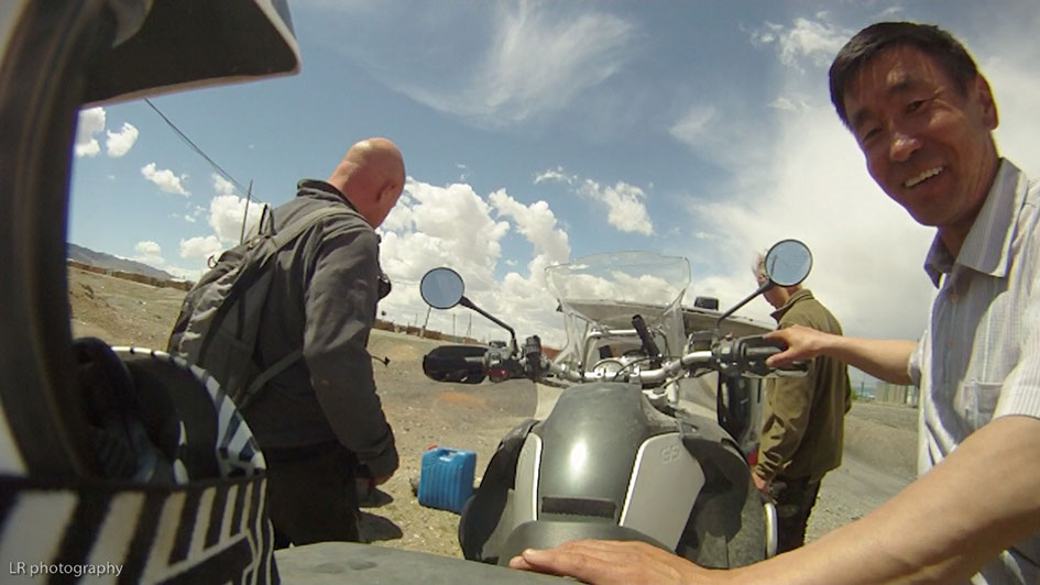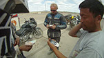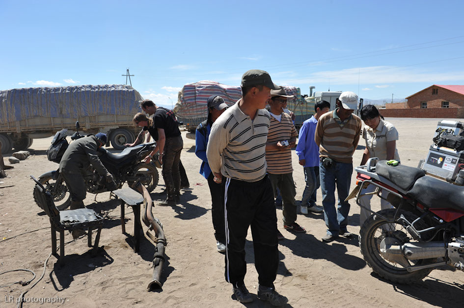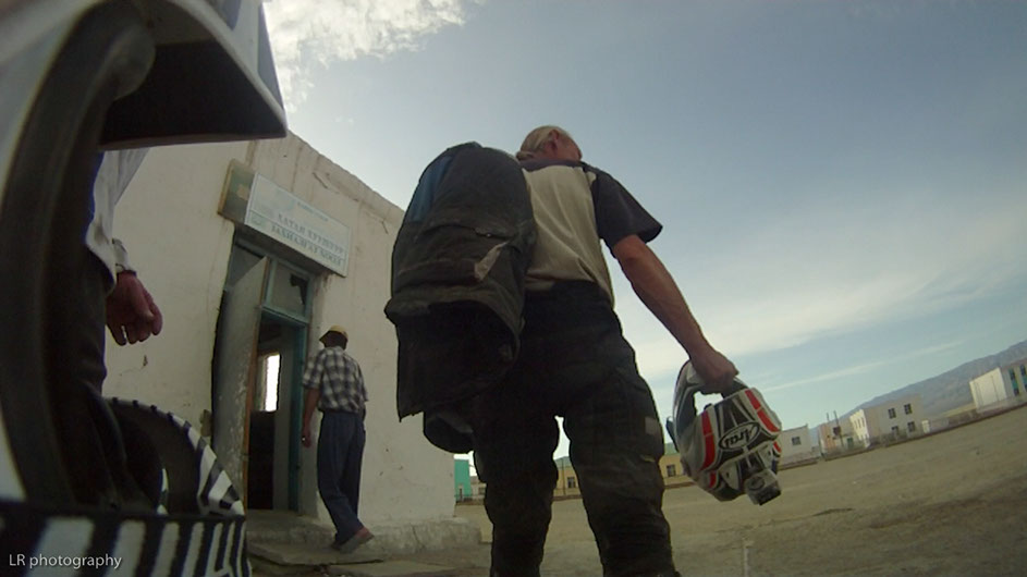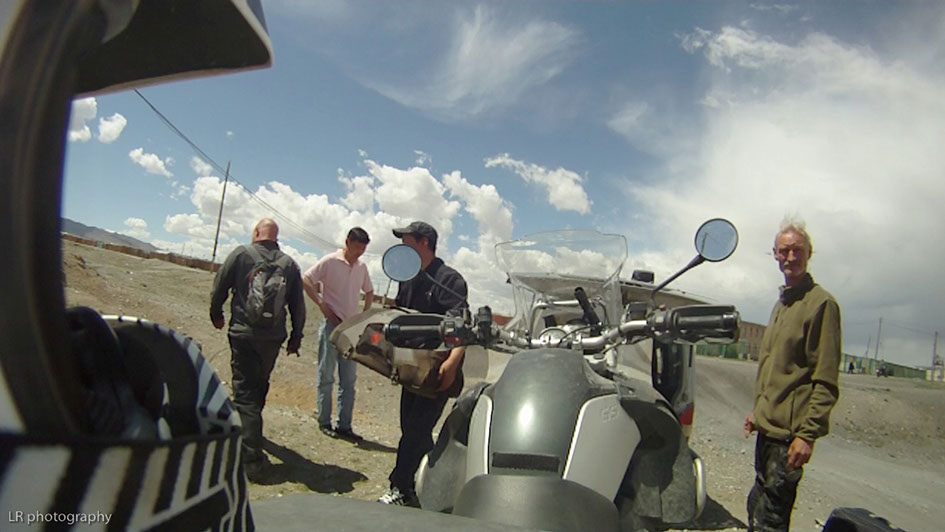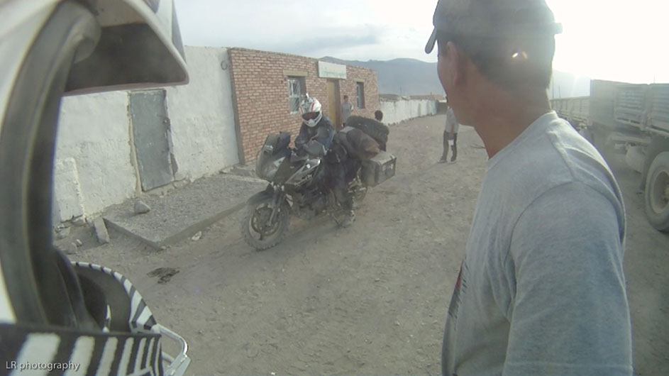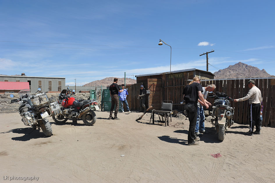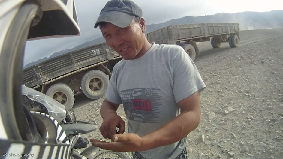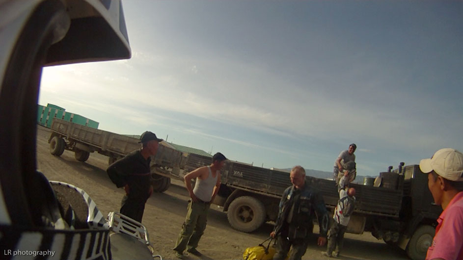 Dans l'immédiat, on tente d'expliquer mon problème de suspension à un villageois qui parle 3 mots d'anglais. Lui nous conseille d'aller à Altai, là-bas selon lui il y a ce qu'il faut pour réparer. Il nous conseil également d'attendre le prochain camion pour y charger les motos, car les pistes ne sont pas franchement bonnes d'ici à Altai.