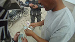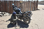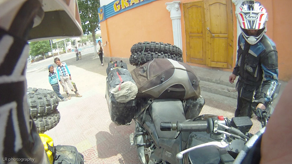 en périphérie de ville nous chargeons les bécanes dans le van. Wogii est présent, intrigué par nos engins..