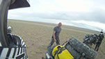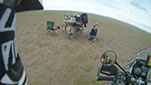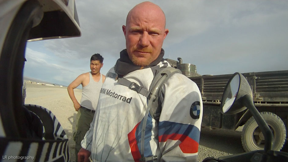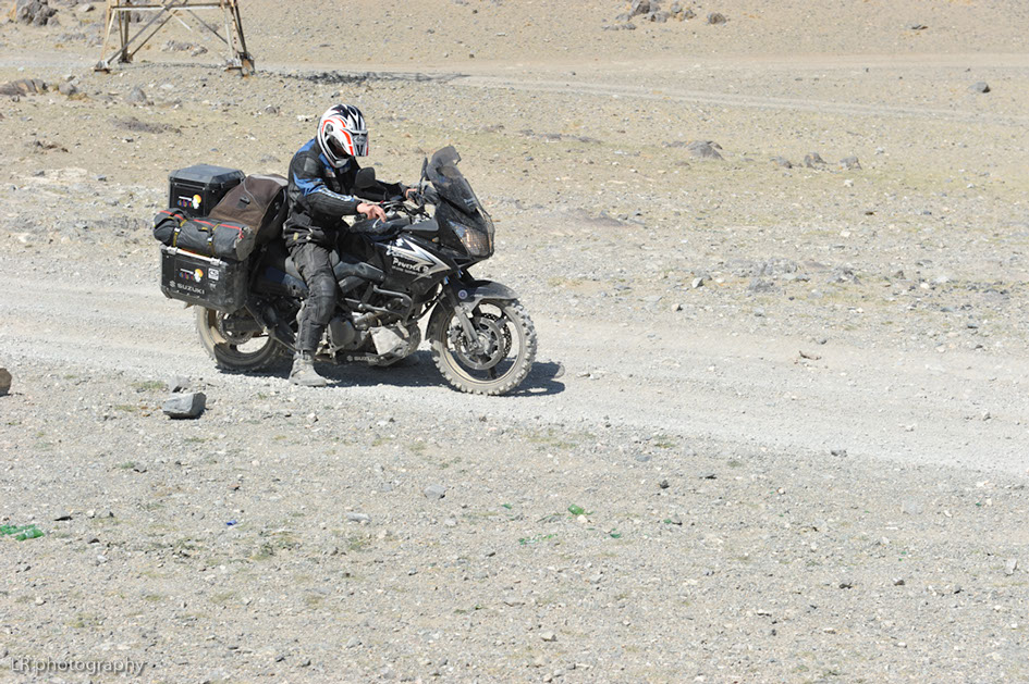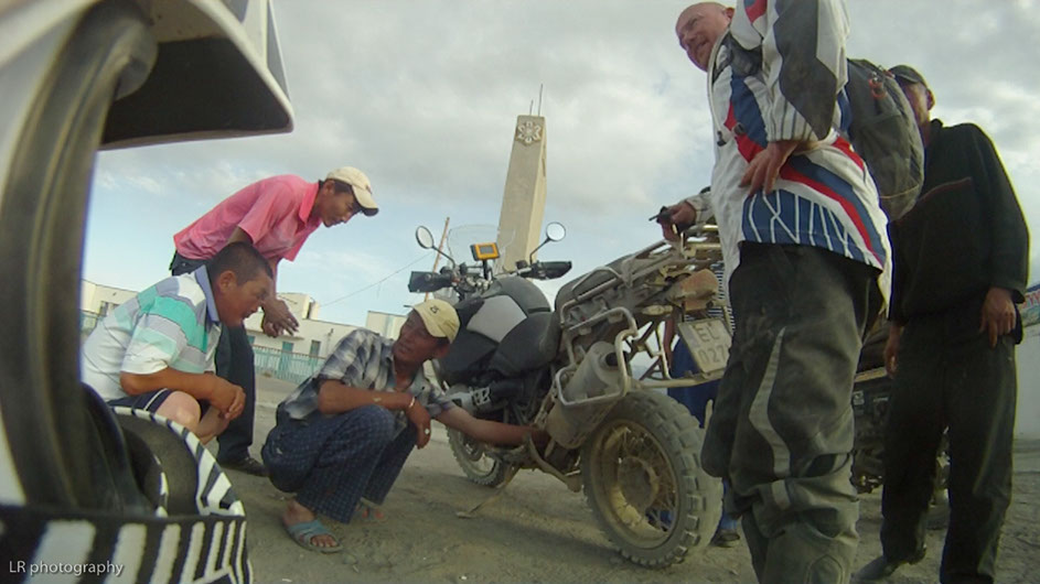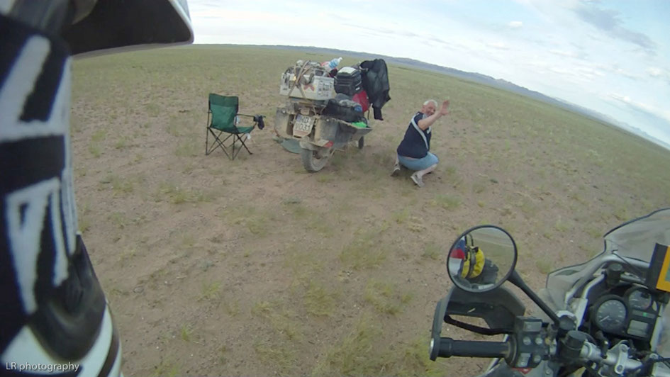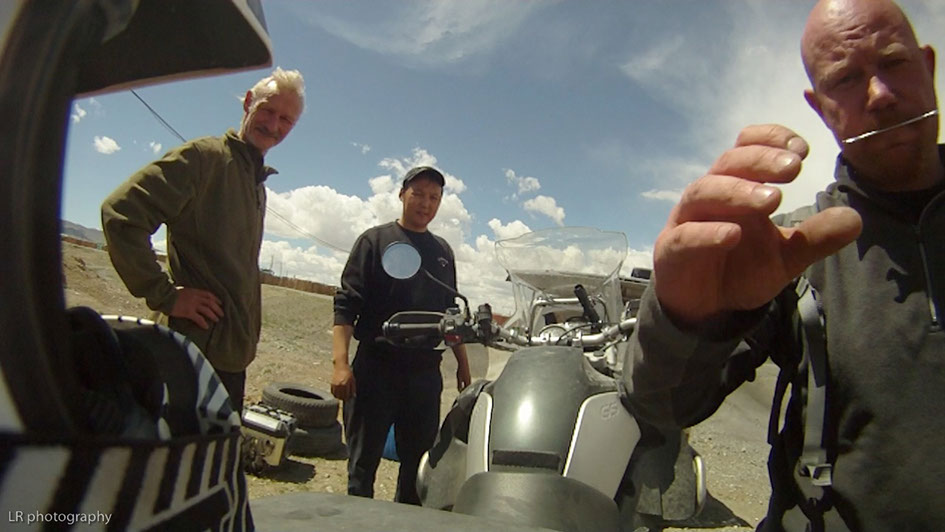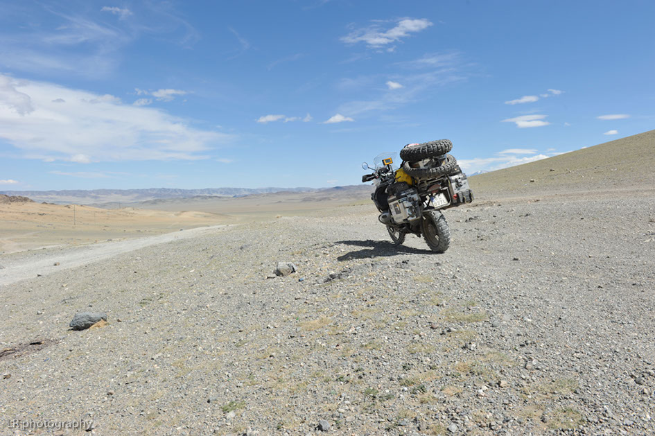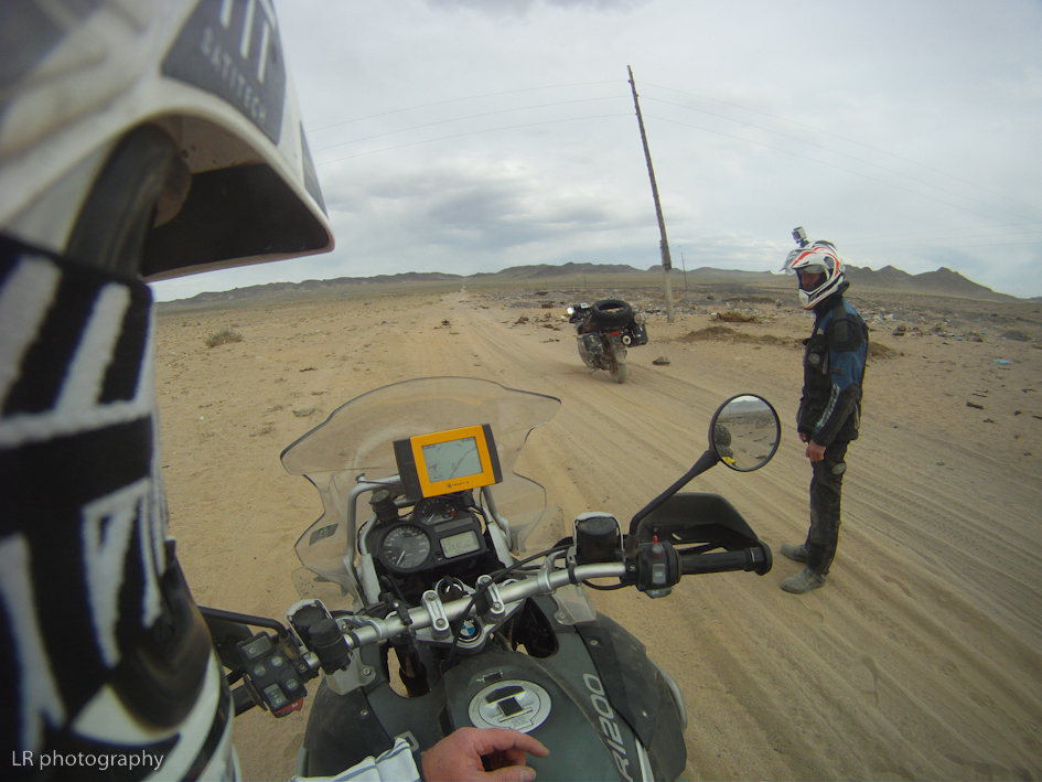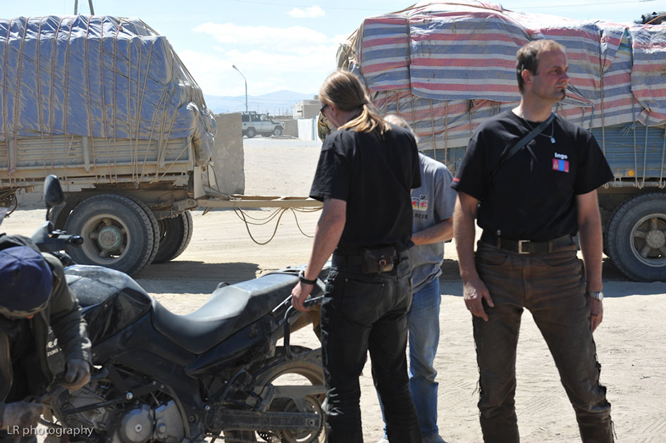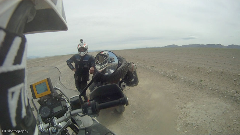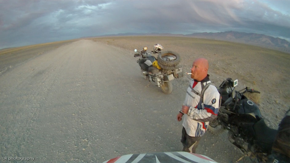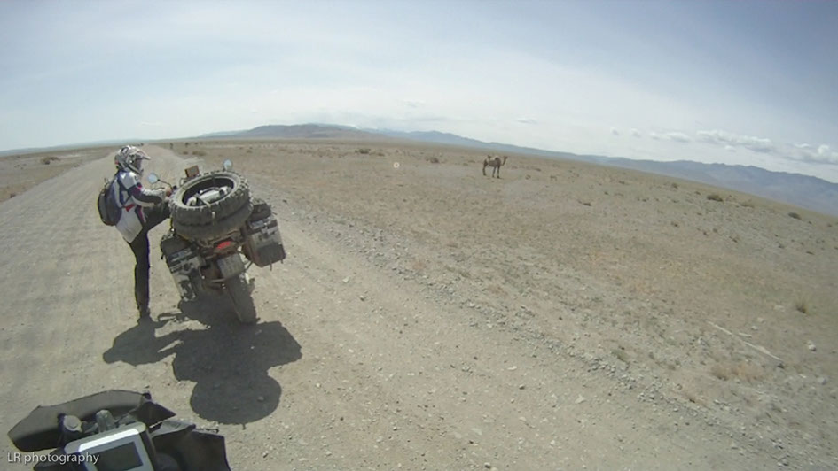 On plie bagages et, arrivé aux motos on constate qu'un pneu de la Suz est plat, et une pièce de protection du cardan de la BM à été arraché. 60km seulement ont été effectués en Mongolie, et la mécanique souffre déjà.