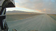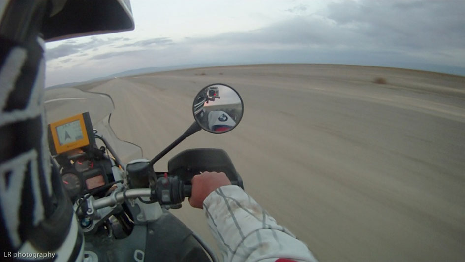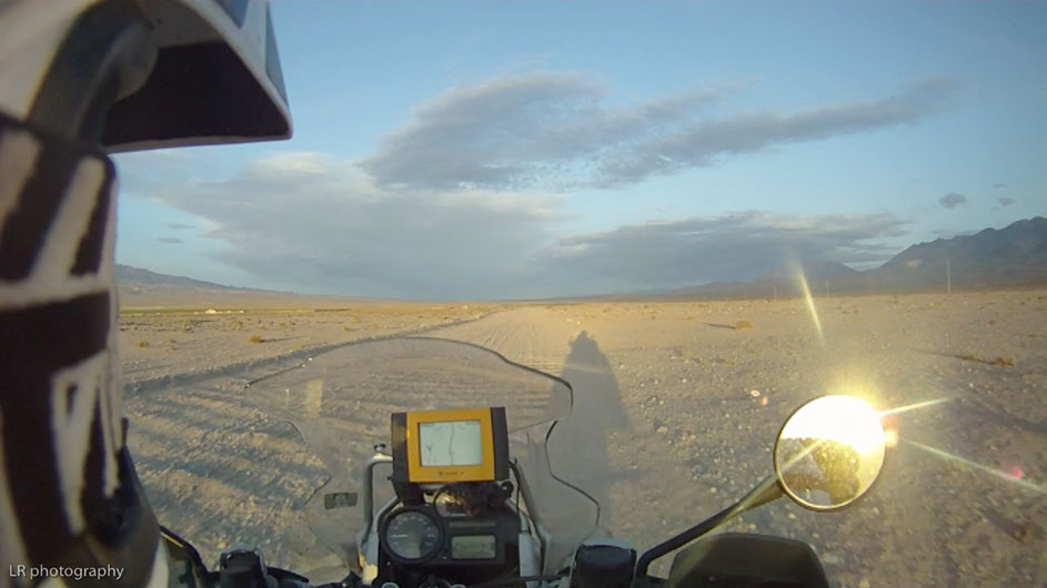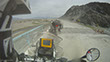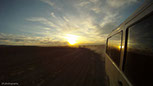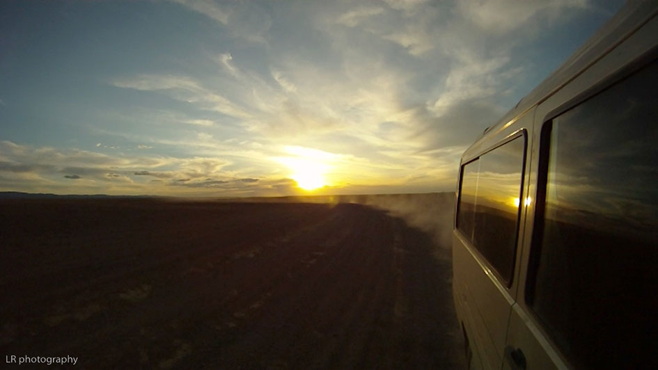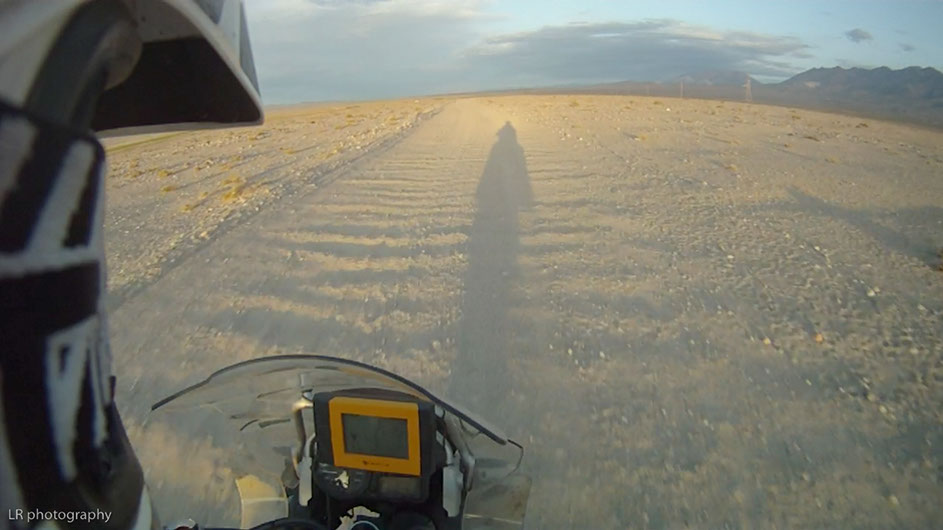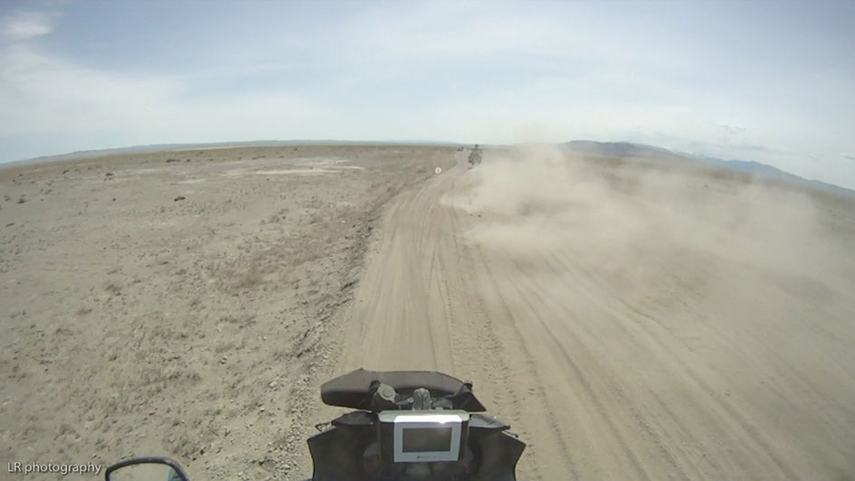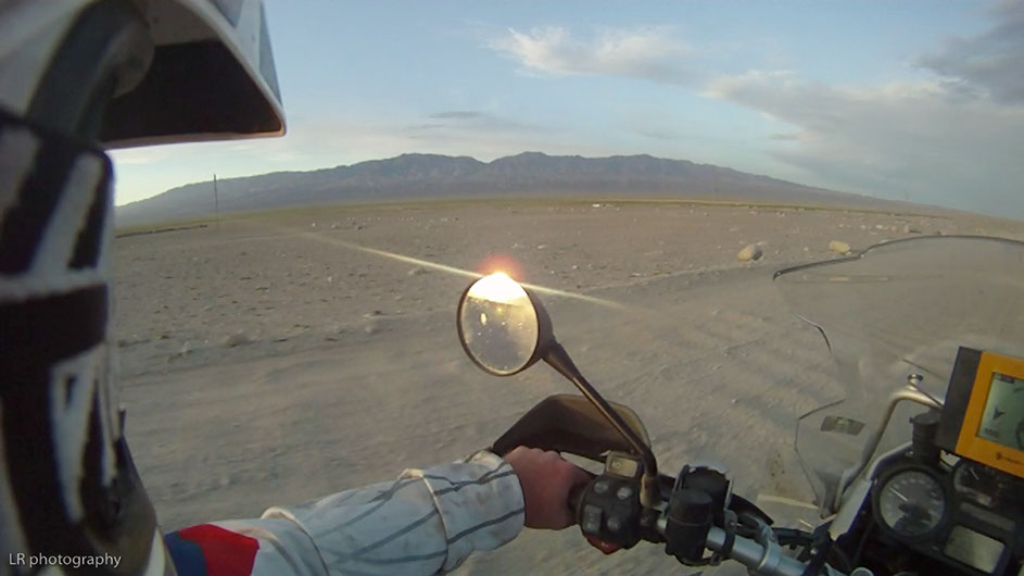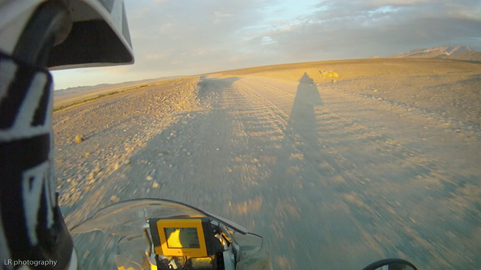 Il se fait tard, la lumière baisse, alors on augmente encore un peu le rythme. A cet endroit nous devons rouler dans les traces de pneus des camions. Généralement on choisi l'un et l'autre une trace différente, par sécurité et pour éviter les projections de cailloux.