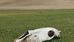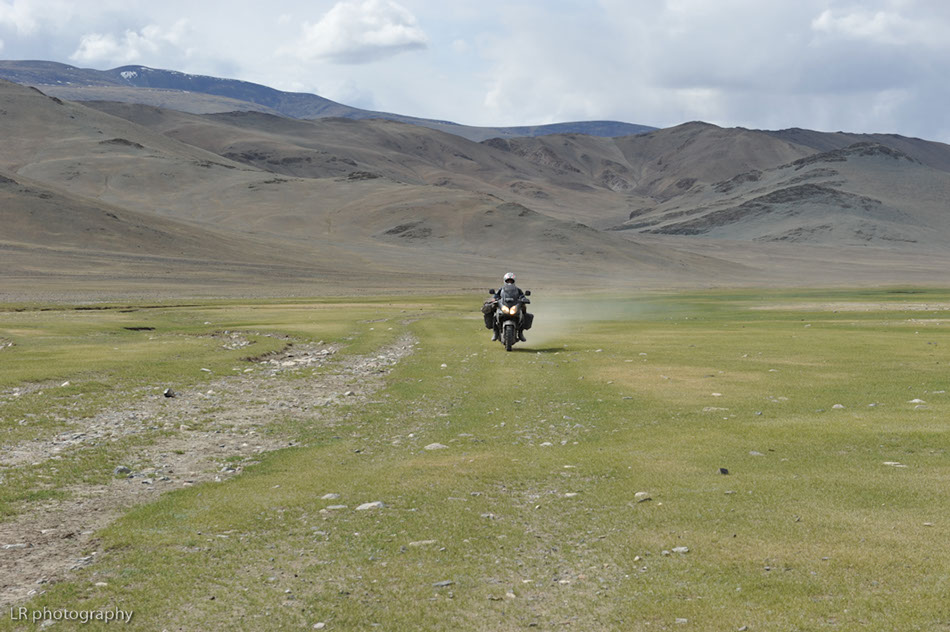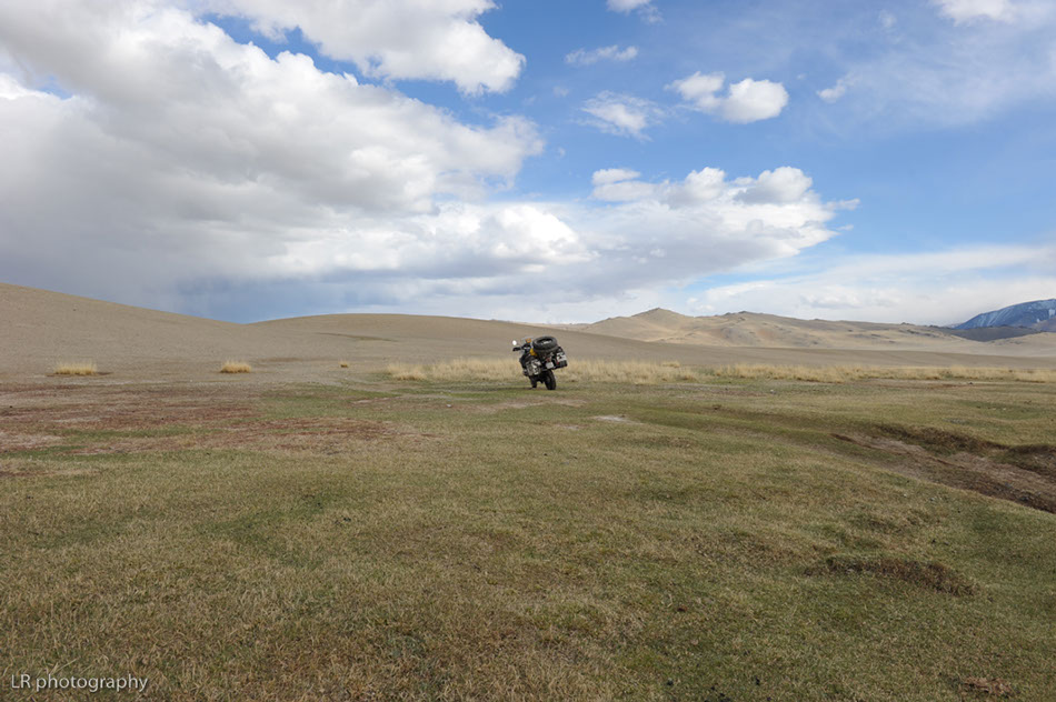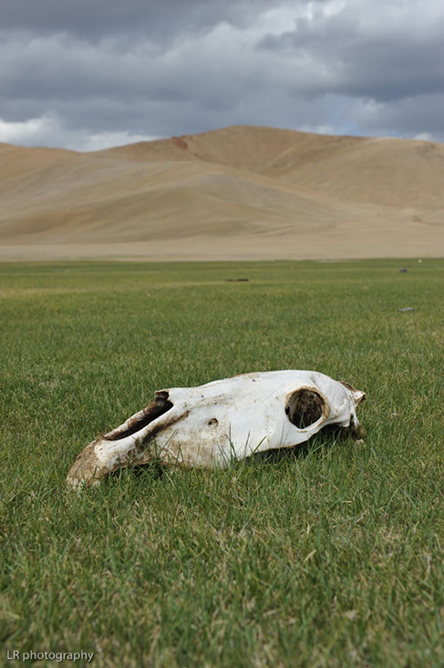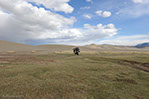 Quelques "heures" plus loin, après avoir croisé deux ou trois yourtes et ses habitants nomades, quelques troupeaux de yaks et après être passé d'une vallée à une autre, nous arrivons sur un superbe haut plateau verdoyant. Nous sommes à plus de 2200m d'altitude, et à voir les ossements disséminés de ci et de là, il semble que la vie ne se soit pas des plus aisée en ce lieu malgré l'abondance de l'herbe à cette saison, et pour nous ça se corse aussi. La piste que nous voulions suivre n'existe plus, elle se perd dans une gigantesque dune de sable et disparaît. Il nous faut donc emprunter une autre voie, invisible sur notre RoadBook, et avancer à la boussole, en espérant ne pas se perdre dans ces montagnes.