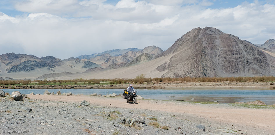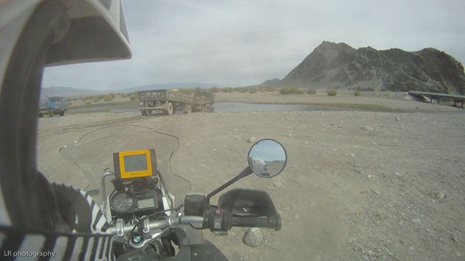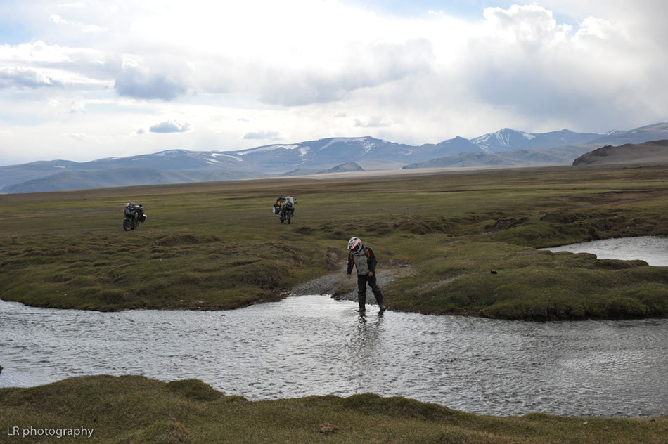 Plusieurs heures s'écoulent et on avance toujours, dans la bonne direction, mais sans certitudes que ce semblant de piste nous même réellement quelque part. Au passage d'un ruisseau nous rencontrons un nomade et son fils qui nous confirme que la piste que nous suivons nous amènera bien à Khovd. Il nous faudra tout de même faire un détours de plusieurs kilomètres pour trouver un passage correct pour franchir la rivière. Le Pamir et ses torrents d'eau se rappelle à notre souvenir et nous ne prenons aucun risque lors de passage de point d'eau.