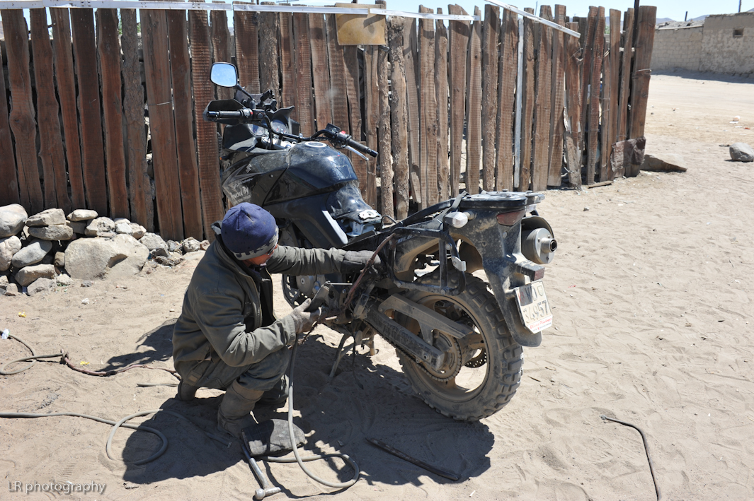 Malgré les difficultés à rouler sans amortisseur, nous prenons la décision de reprendre la route, plutôt que d'attendre un camion qui peut n'arriver que dans quelques jours...