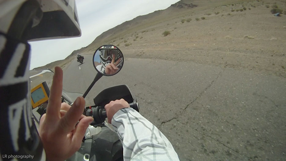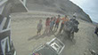 Premier avertissement : au milieu de la caillasse, une zone de sable. Crothe passe en plein dedans..chute! Un pied coincé sous une caisse alu, mais par bonheur rien de plus grave. La moto remise sur ses roues ne présente aucun dégâts..ouf!