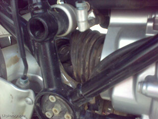 Après 50km à une allure assez soutenue, ma BM' commence a danser, a s'onduler bizzarement. Je m'arrête et je constate que mes bottes sont pleines d'huile...oups.. L'amortisseur arrière a rendu l'âme, de l'huile s'échappe de l'intérieur du cylindre..il y en a partout.