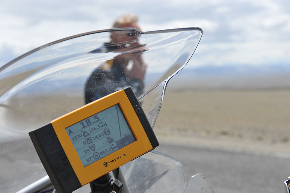 Lors d'une étape dans les montagnes Tadjikes, nous sommes en pleines tempête de neige, suivit de fortes pluies durant de longues heures, et là mon Tripy se bloque, se perd, s'éteint et se rallume comme bon lui semble. Le plus ennuyeux est qu'il comptabilise les kilomètres à l'envers, donc plus je roule et moins j'ai de km au compteur général...bizzard..!