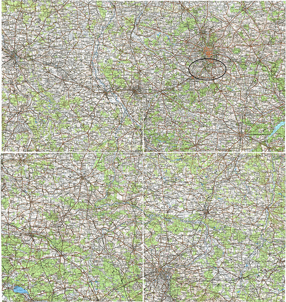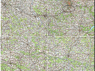 On obtient par transparence une vue actuelle des routes, des courts d'eau des bâtiments existants, sur notre carte topo russe.