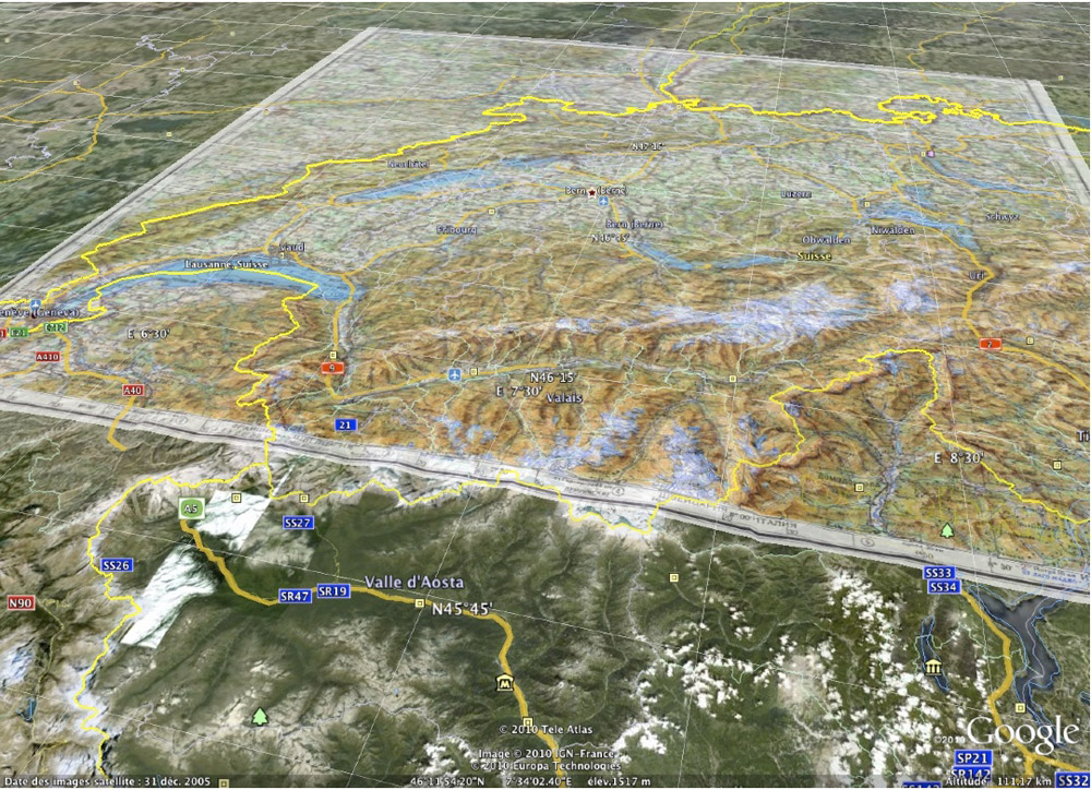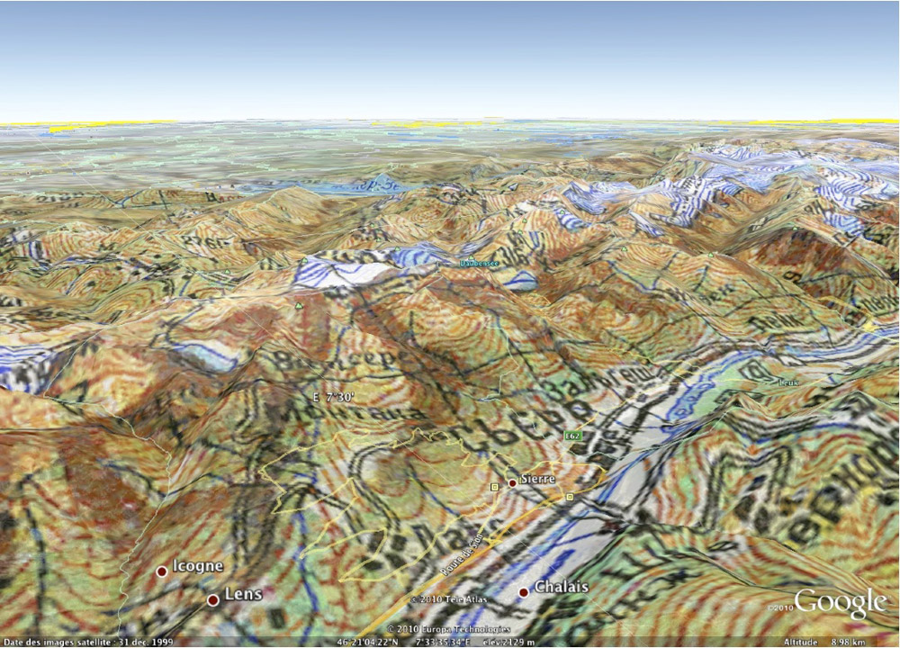 Il suffit de superposer une carte topo sur une zone de Google Earth, en appliquant très précisemment la correspondance des données de géo-référence, et le tour est joué.