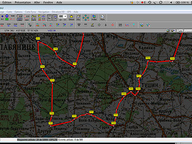 La trace est en rouge, elle comporte des points (actifs) en blanc. Cette polygonale est parfaitement superposée sur la route que nous voulons emprunter. Les courbes réelles de la route sont en fait des successions de petites lignes droites, mais les points remarquables sont parfaitement placés sur la carte.
