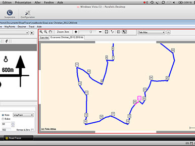 La capture d'écran ci-contre montre un essai que nous avons effectué pour tester et nous habituer à la bête. La carte est volontairement foncée pour mieux y distinguer notre trace.