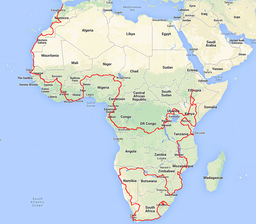 Afrique du Sud, Lesotho, Namibie, Botswana, Zimbabwe, Swaziland, Mozambique, Malawi, Tanzanie, Kenya, Ethiopie, Ouganda, Ruanda, Congo RDC, Congo Brazzaville, Gabon, Cameroun, Nigeria, Niger, Burkina Faso, Togo, Ghana, Côte d’Ivoire, Mali, Guinée, Sénégal, Mauritanie, Maroc.