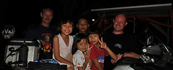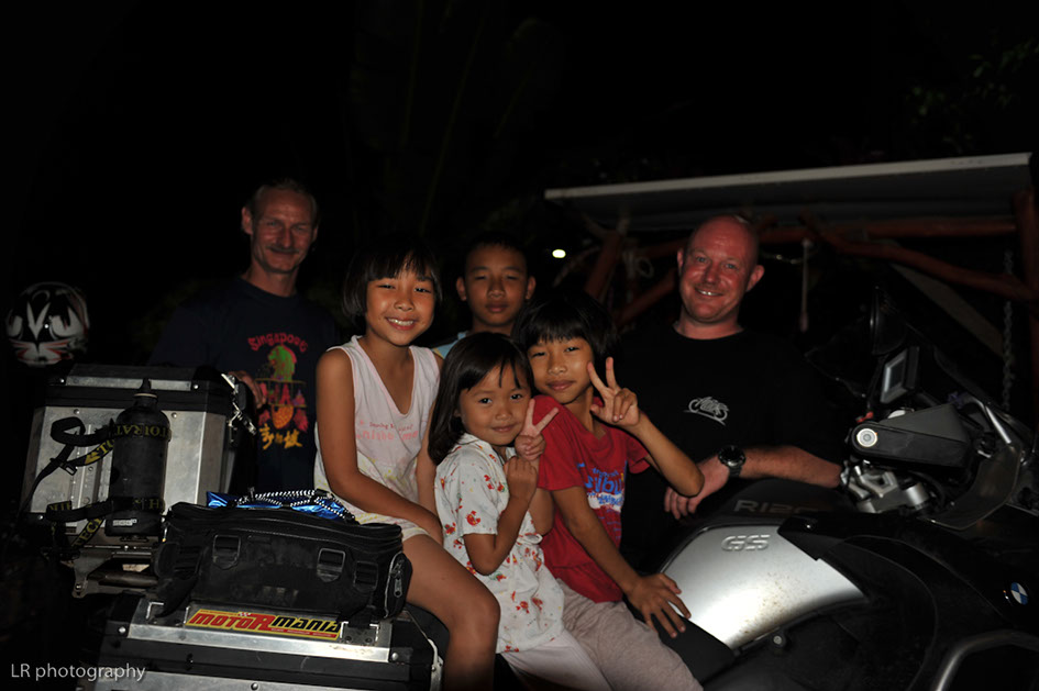 Après cette journée de 'farniente' nous partons en direction de Kalasin. 280km de route sous une pluie qui se transforme en véritable trombe d'eau durant la dernière demi-heure avant d'arriver à Kalasin..c'est la mouson! Le soir nous faisons un petit détour par Sahat Sakhan pour rendre visite à ''mes petits''..plus si petits que ça. On passe une petite heure avec eux, qui nous ont suivis et soutenus durant tout le voyage. Ils peuvent enfin voir les motos en vrai, mais c'est le moment de continuer. Pas facile de repartir si vite..ils me manquent déjà..